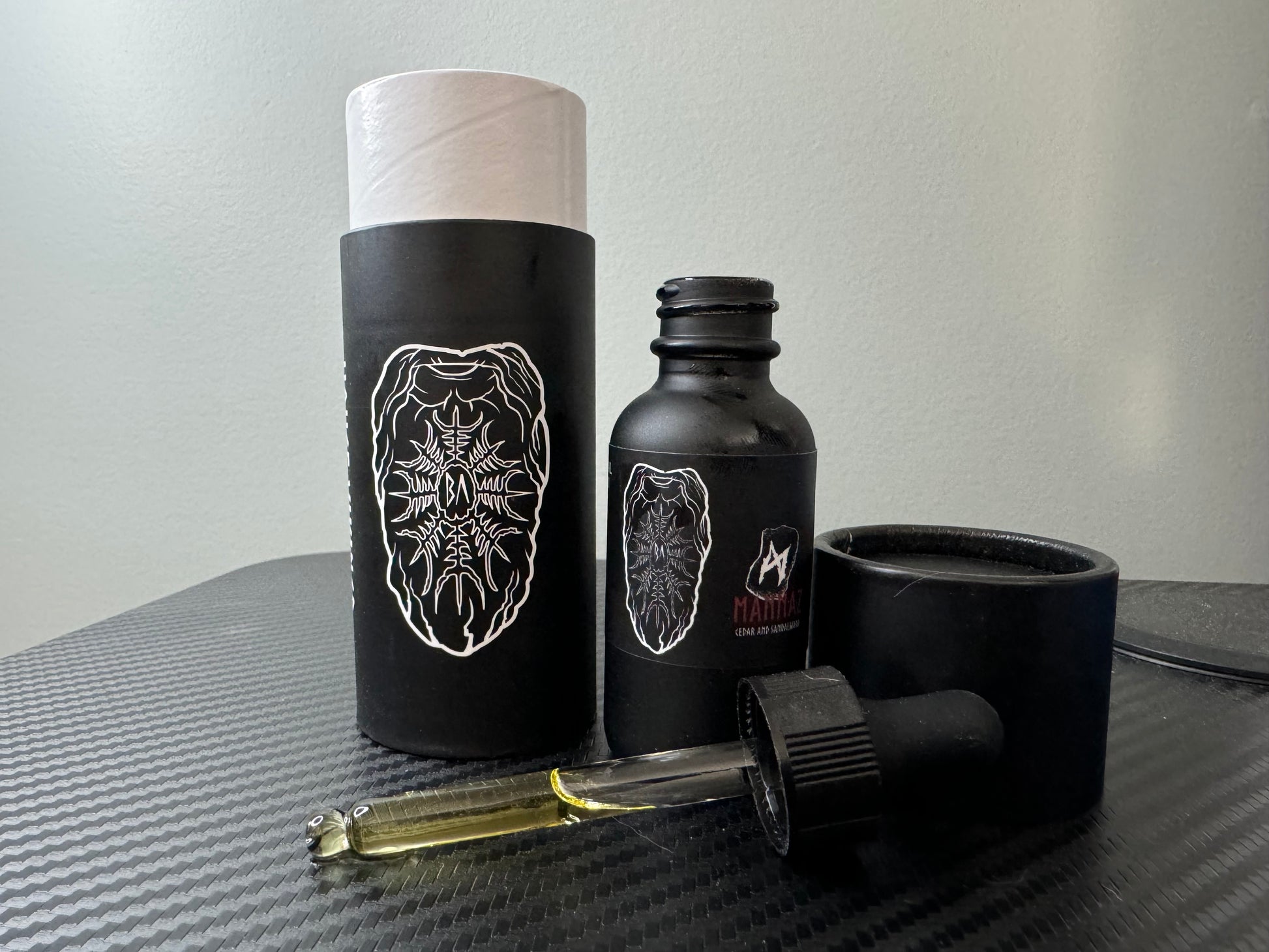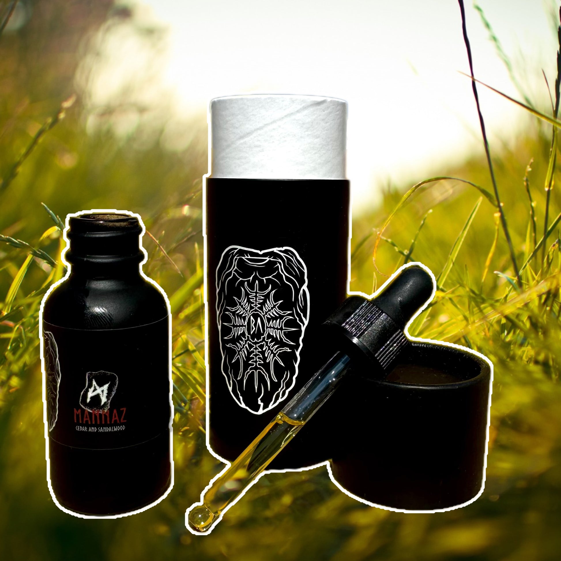 Base is jojoba oil and sweet almond oil. The scent is cedar and sandalwood forward with hint of cinnamon and tea tree oil.