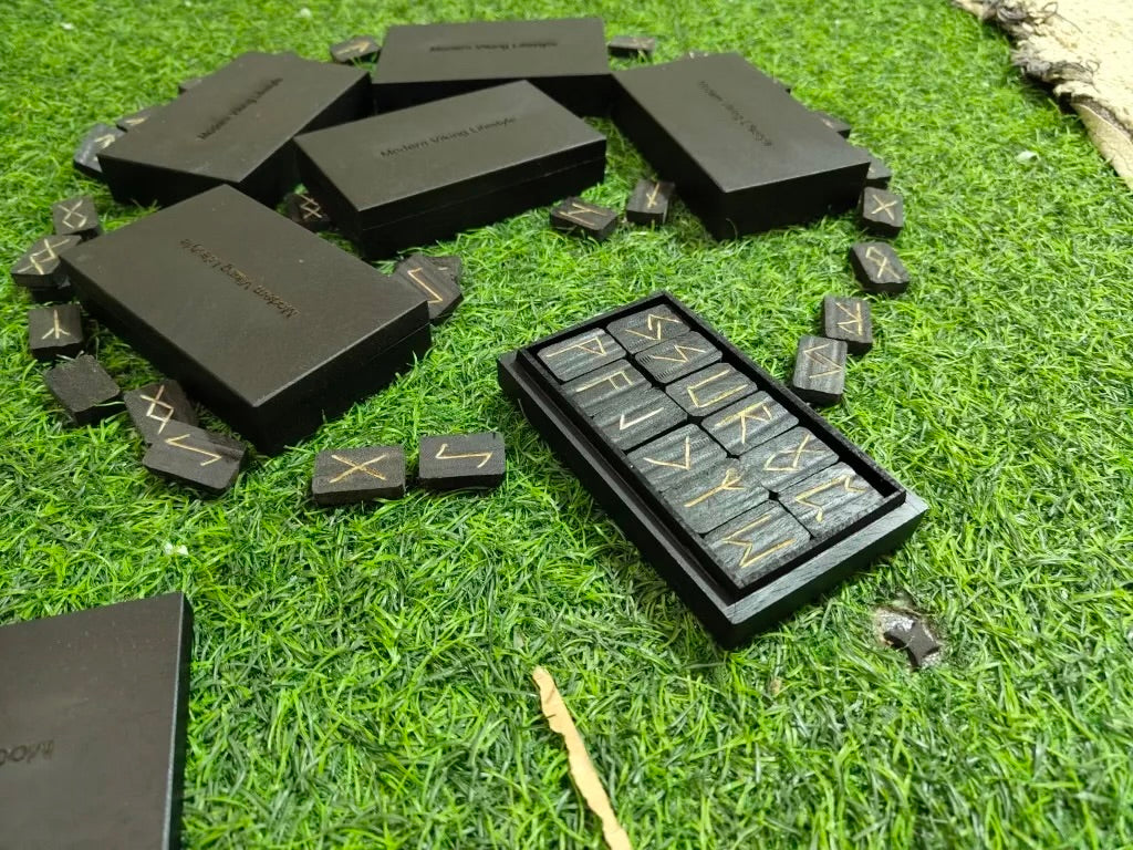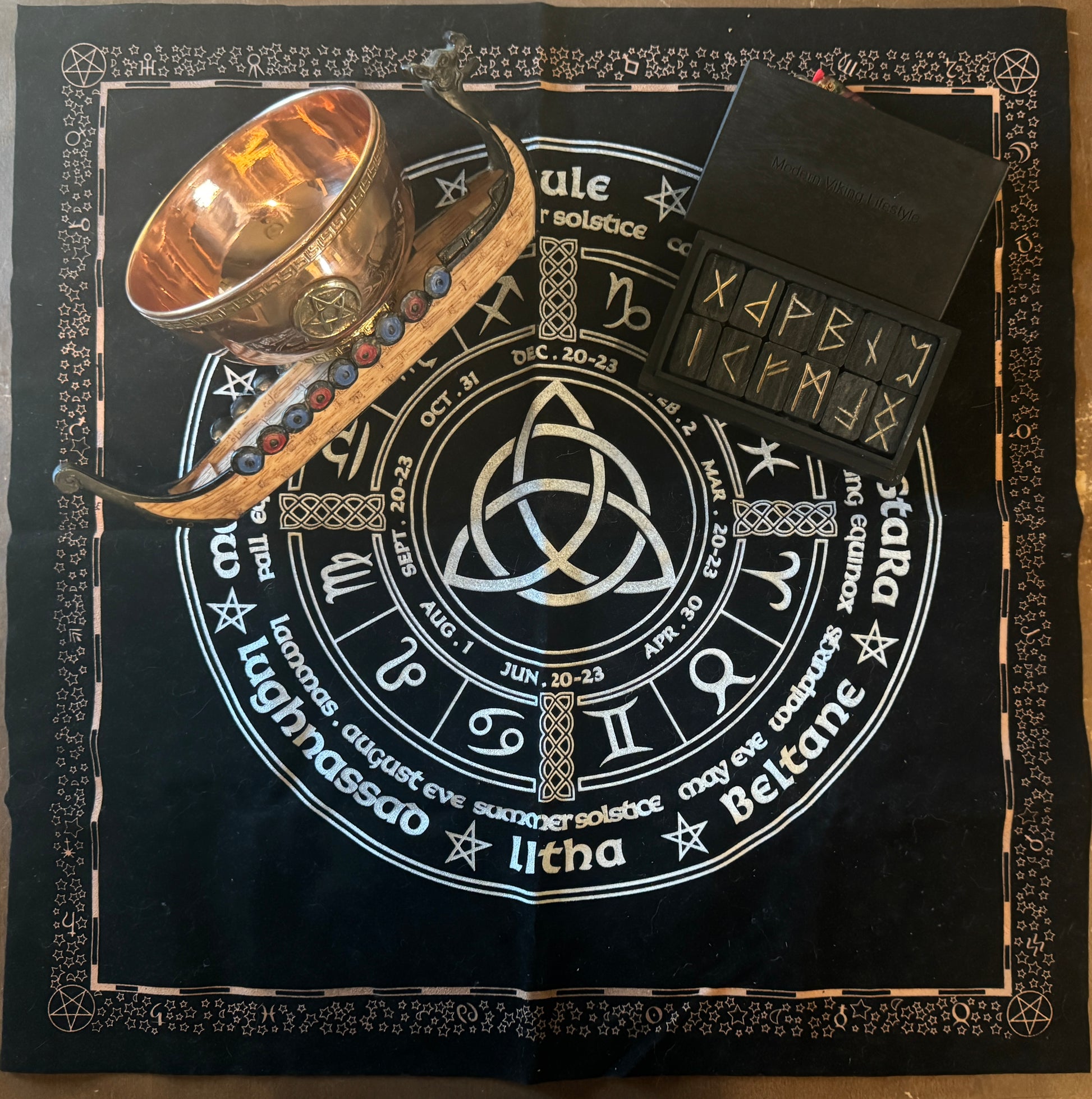 It includes: a wooden rune set to practice divination, altar bowl for offerings, incense holder in the form of a longship and altar cloth for a sacred space to do your practice.