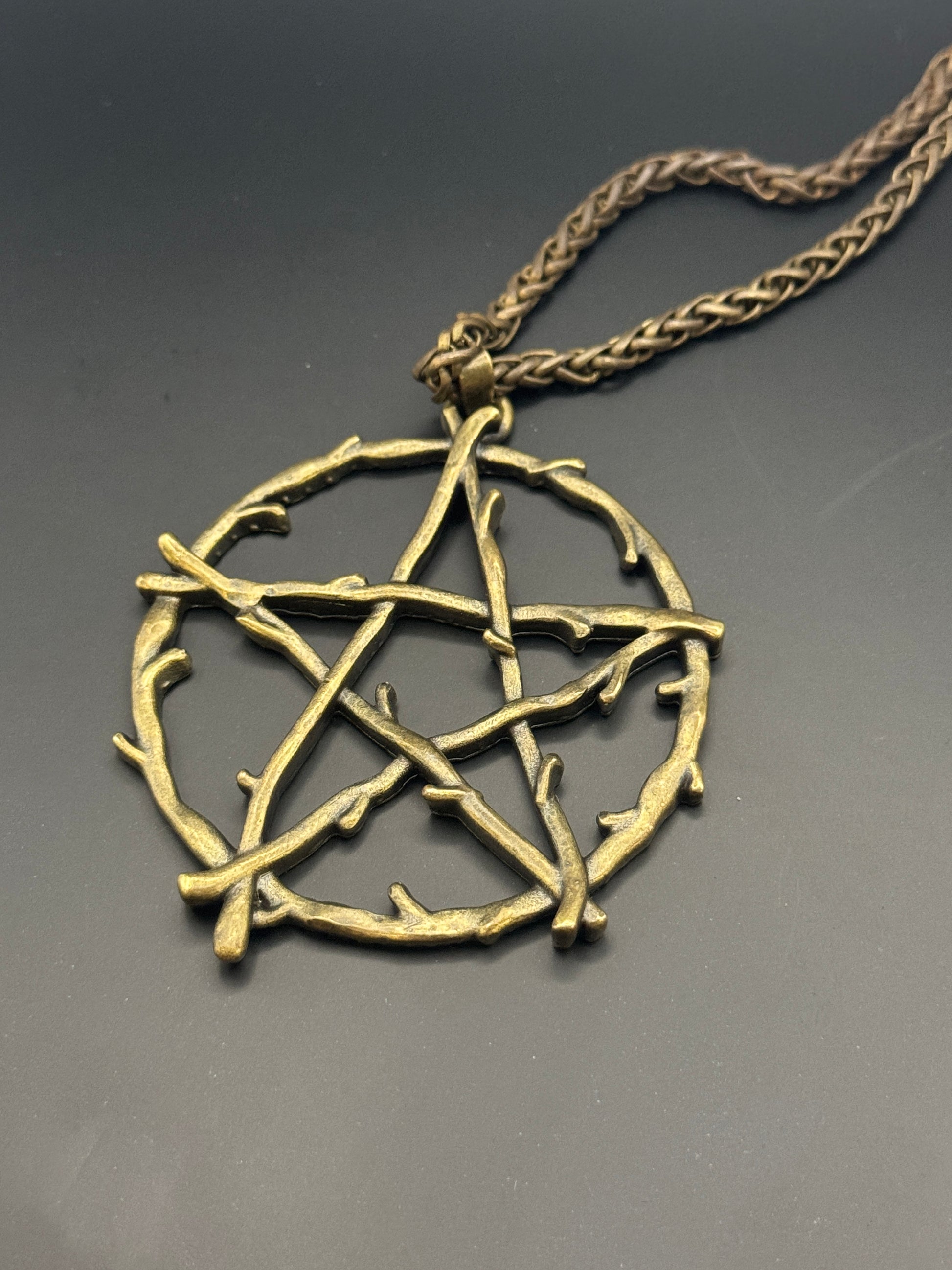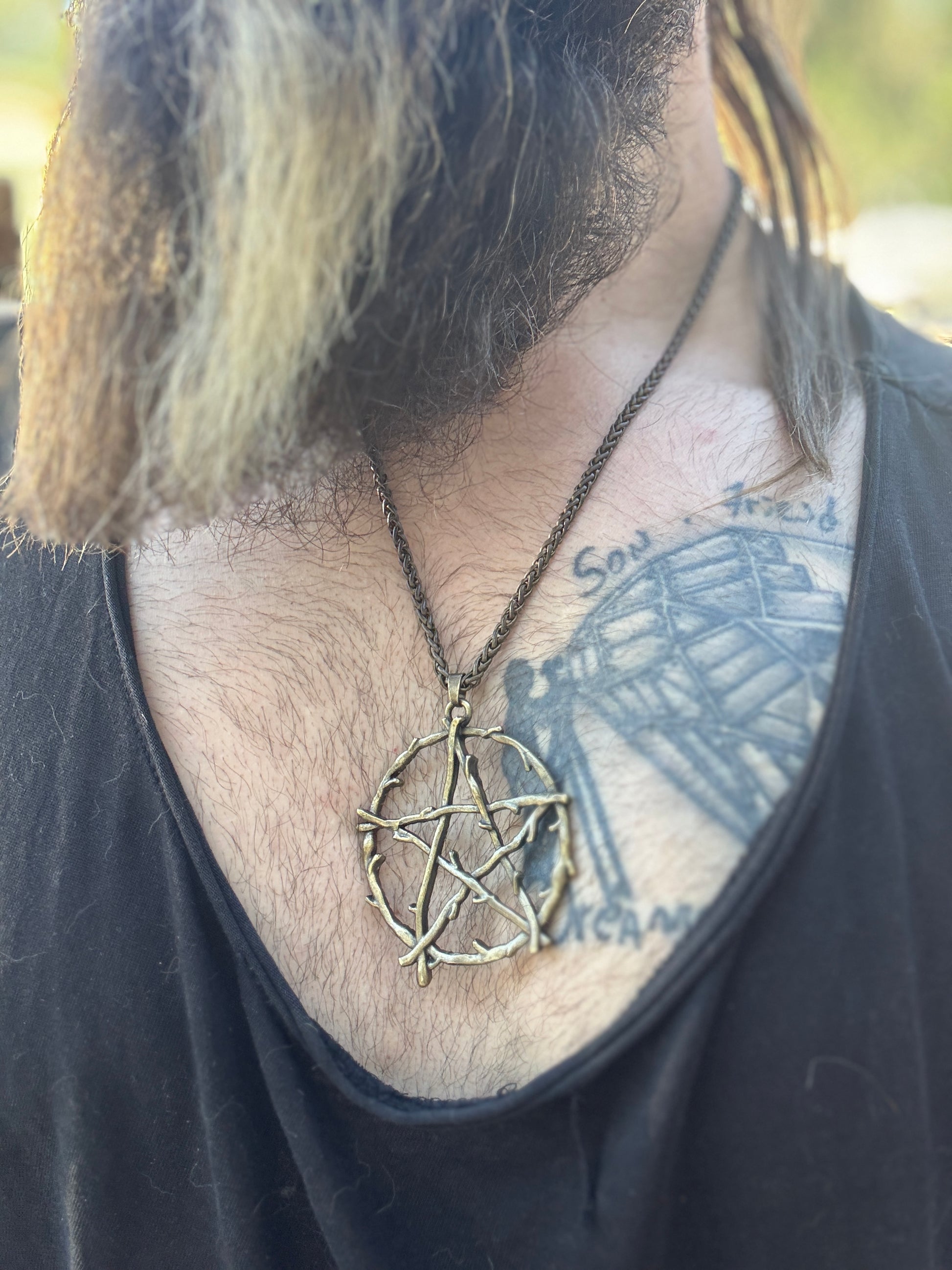 Introducing the Classic Pentacle Necklace, a timeless piece with an earthy, ancient aesthetic. The pentacle pendant is designed to appear as though it’s crafted from intertwined sticks, evoking a deep connection to nature. Bronze-colored with a weathered finish, it captures the essence of ancient craftsmanship. Made from durable metal alloy with a bronze coating, the pendant measures 60mm x 64mm, paired with a 60cm chain that has a sturdy 4mm thickness. This necklace is perfect for those seeking to blend natural symbolism with a rustic, old-world charm.