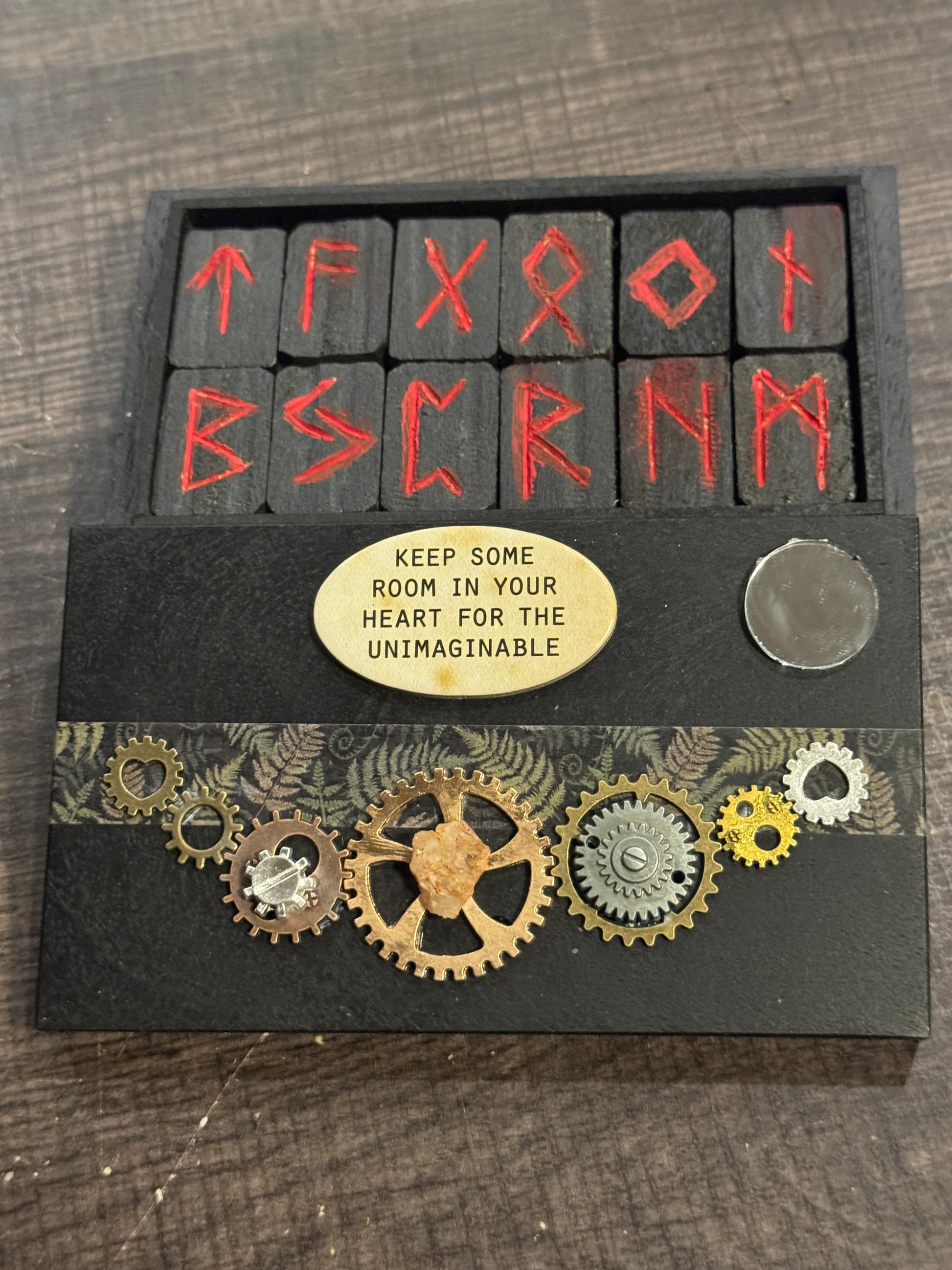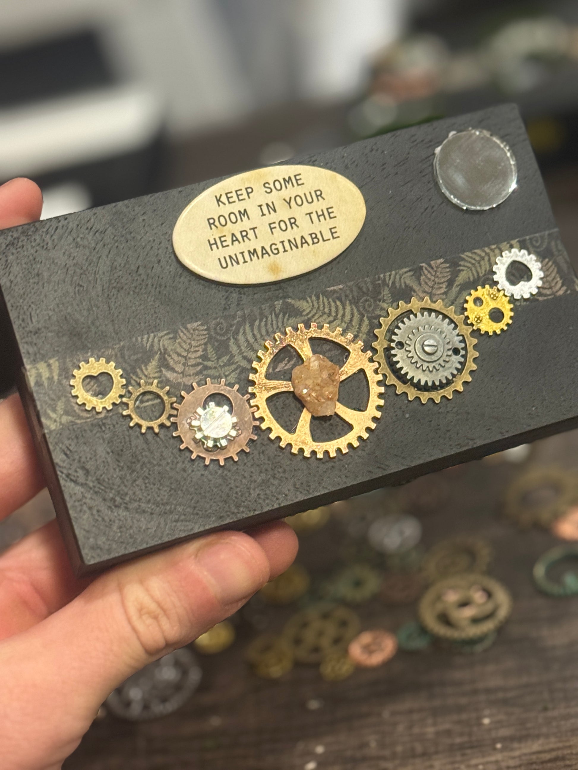 This piece features two small circular mirrors placed on opposite ends. They reflect in different directions, yet remain part of the same system… a reminder that polarity is not separation, but relationship. Each side exists because the other does.