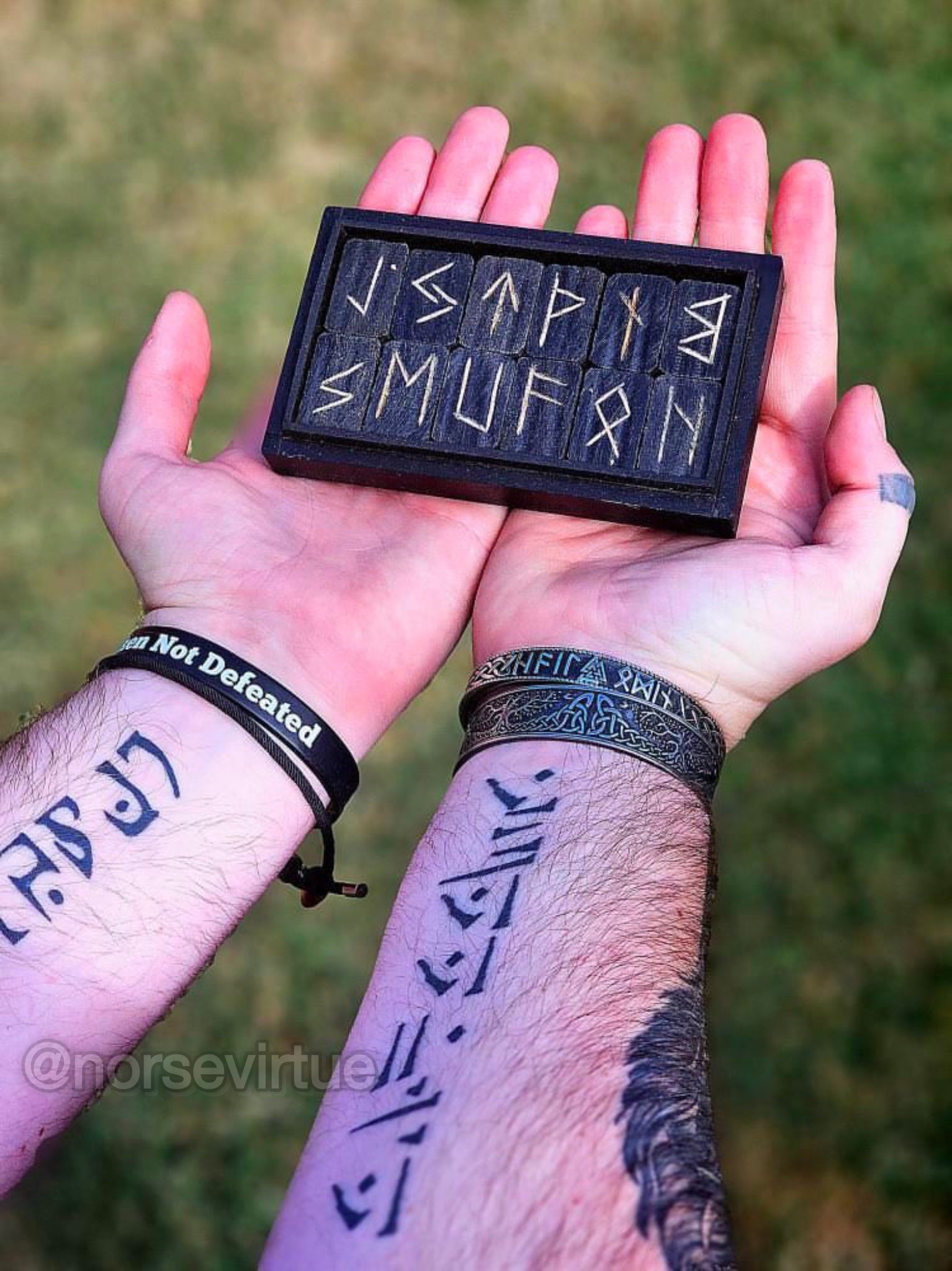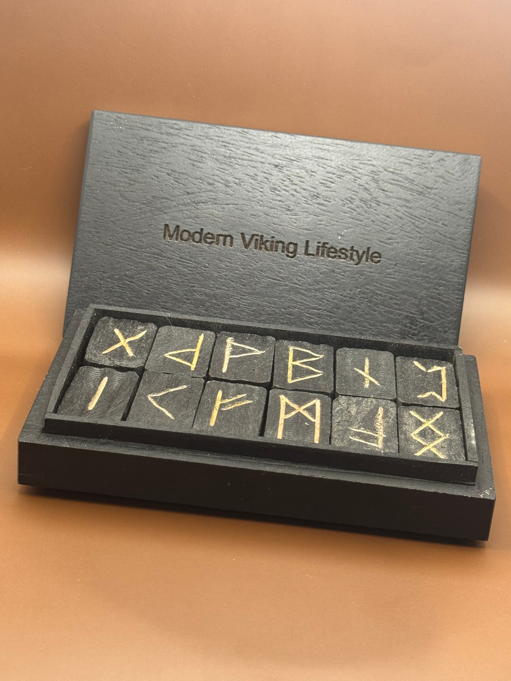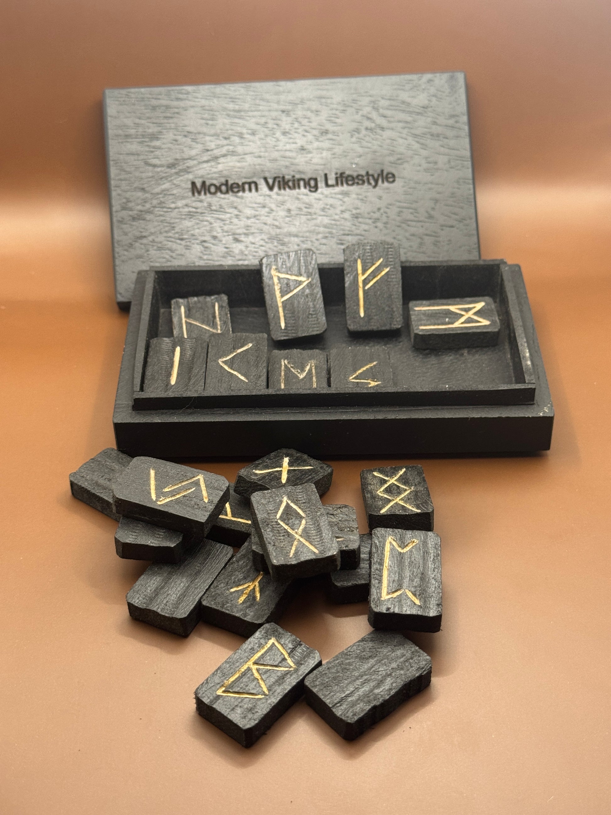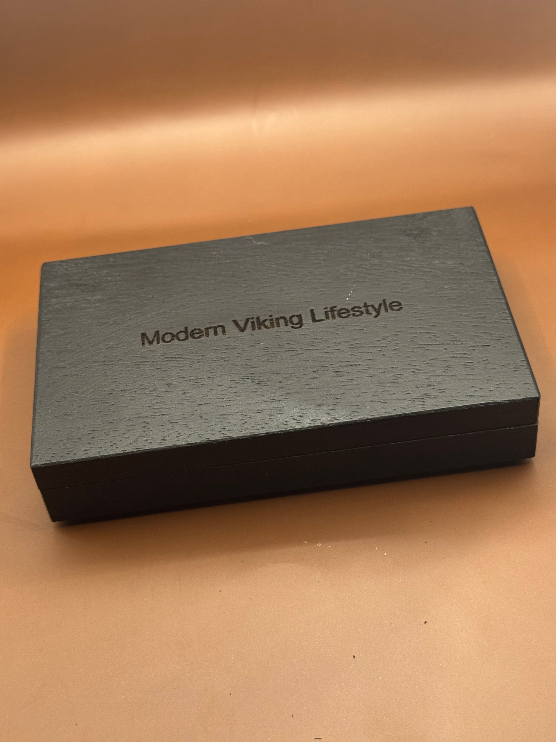 Introducing the MVL Rune Set—a beautifully crafted box of Elder Futhark runes designed for modern-day seekers of ancient wisdom. Each rune is meticulously carved from black wood, featuring striking gold engravings. The square-shaped runes come housed in a compact 12cm x 12cm x 4cm box, topped with a custom “Modern Viking Lifestyle” logo, blending tradition with a sleek modern touch. Perfect for spiritual practice, divination, or as a meaningful gift for those embracing the Viking spirit.