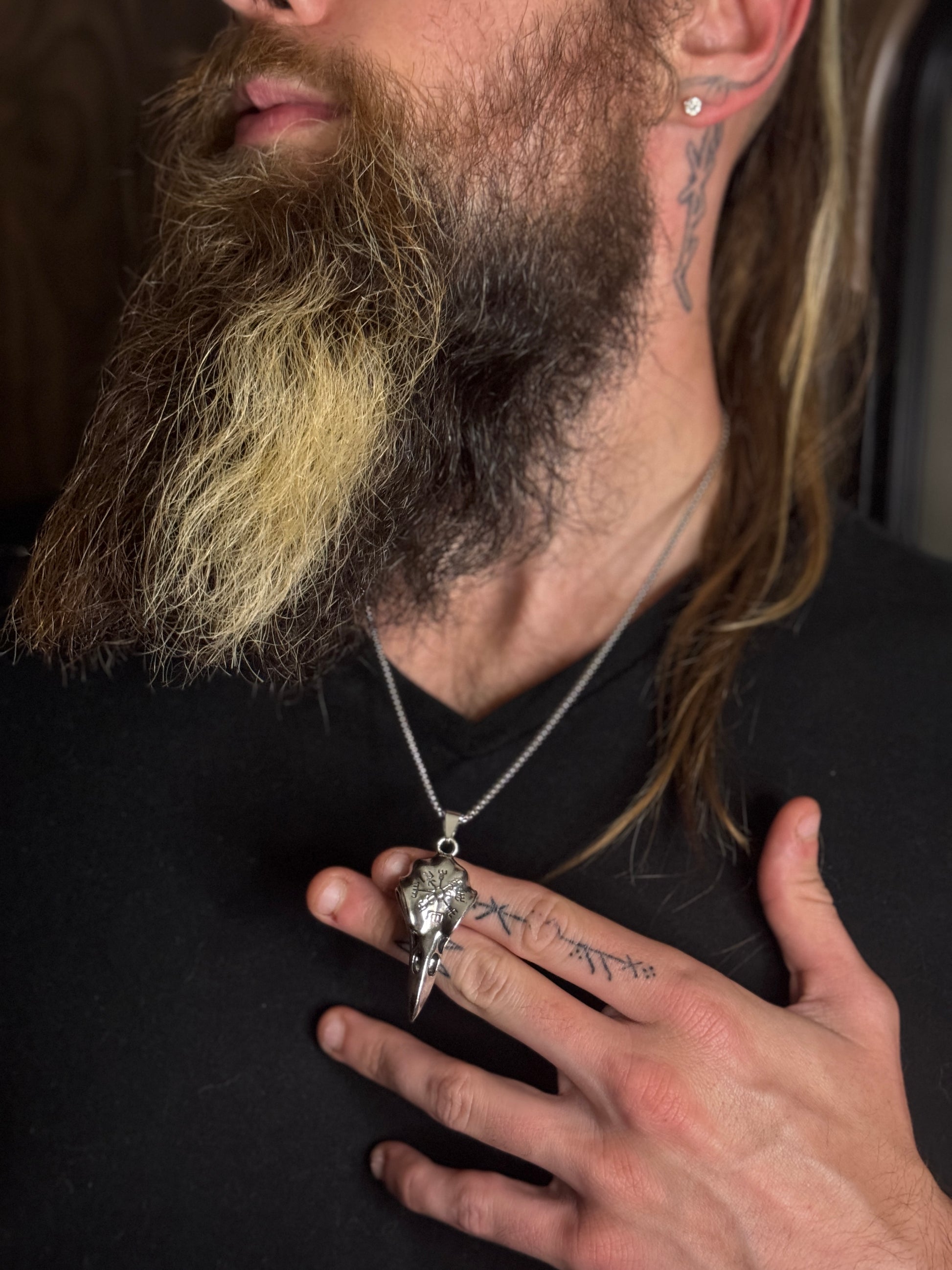 Introducing the Raven Skull Necklace, a bold piece symbolizing Huginn and Muninn, Odin's ravens of thought and memory. The raven skull features the Nordic Compass (Vegvísir) etched on the head, guiding the wearer through life's journeys. Made from silver alloy, this striking pendant hangs on a durable 60cm stainless steel chain with a 2.5mm thickness. Embrace the strength and wisdom of the Viking spirit with this timeless piece, perfect for modern adventurers.